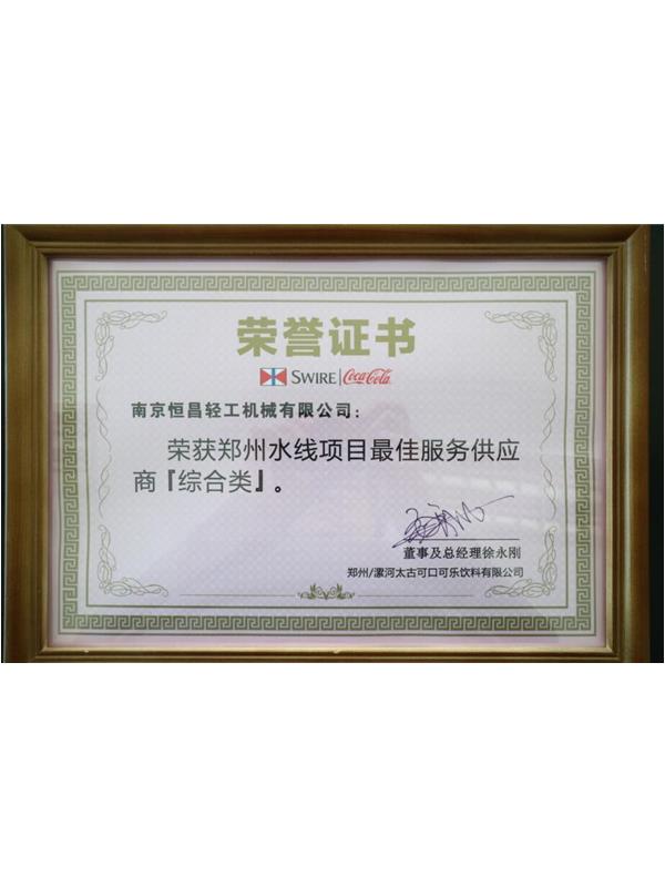 南京恒昌包裝作為后段整包商,在鄭州太古可口可樂48000bph水線項目中獲得“最佳服務供應商”殊榮!